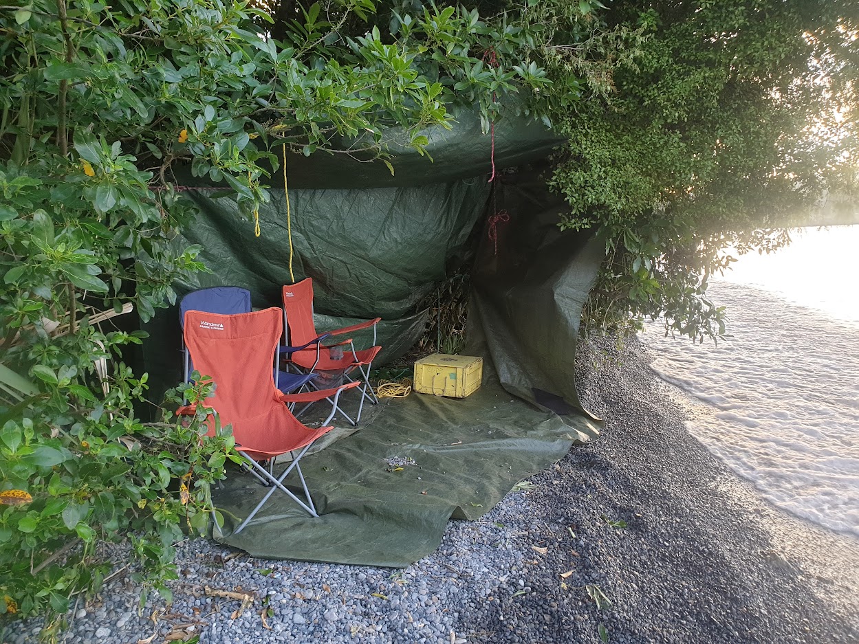 While we were there, we could not beach the cutters. The centre case is of a size that means that pebbles get stuck into the casing and the centre plate can not be used until they are removed. Therefore it was decided that the boats would anchor. The consequence of this however was that the Taupo Lake Harbourmaster required us to maintain an "Anchor watch" over night. All the scouts were involved in this and did a two hour shift each from 10pm every night through until 6 am the following morning for the three nights that the boats were on the water. The scouts set up a bivouac to sit in while they were on duty and the gazebos were set up nearby to sleep in. (not that many of them did, sleeping "al fresco" was the order of the day)